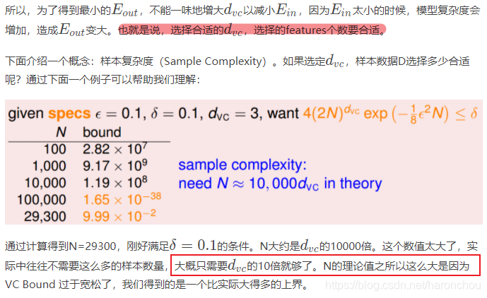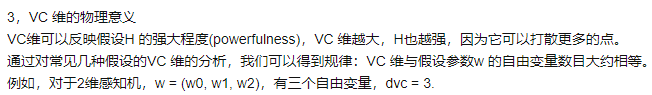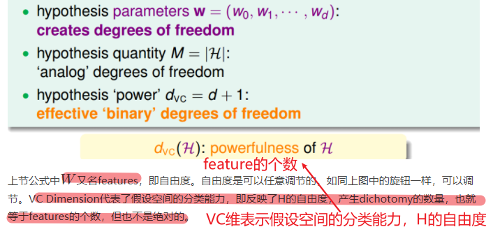 6. VC维的物理意义:反映了H的强大程度,VC维越大,H越强。可以打散更多的点,覆盖更多的样本分布情况。VC维与假设参数w的自由变量数目大约相等。dvc=d+1. d就是空间的自由度,也就是w的自由度。就是特征的维度。