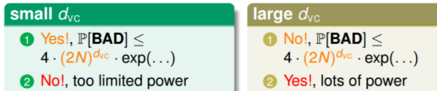 VC维太小,可以保证BadData概率降低;但是选择又太少,不容易实现第二点,即训练误差较小。
