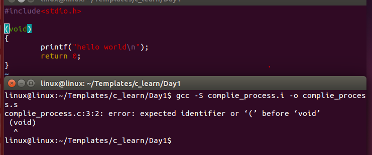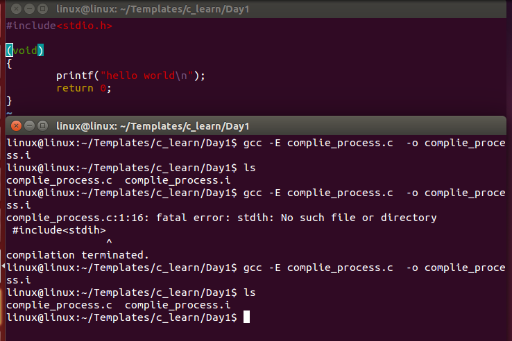 我们将主函数删除,执行gcc -E filename.c -o filename.i 可以看到,并没有报错。所以当我们编译程序的时候可以先使用 gcc -E filename.c -o filename.i看看自己的头文件有没有错误。但是同时要注意,这个命令并不会检查你其他地方的错误。