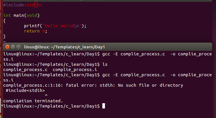 我们使用gcc -E filename.c -o filename.i 命令对程序先进行预处理:处理头文件、宏定义,接下来我们修改一下头文件,使用错误的头文件再看看效果