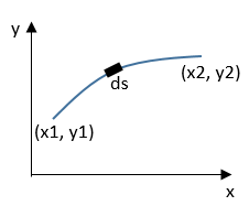 如上图所示路径是一任意路径,我们取区中一小段微元,可以容易计算微元断的长度为: