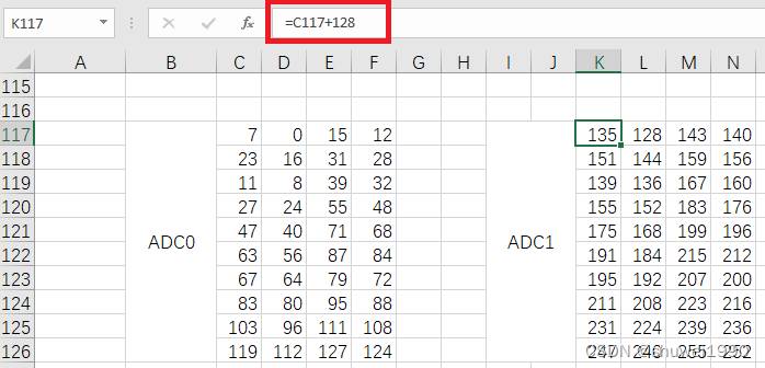 - ADC1的解析数据格式只要在ADC0的解析数据格式里加上128bit即可,可以在excel表格里操作好,然后再复制粘贴到Verilog代码里: