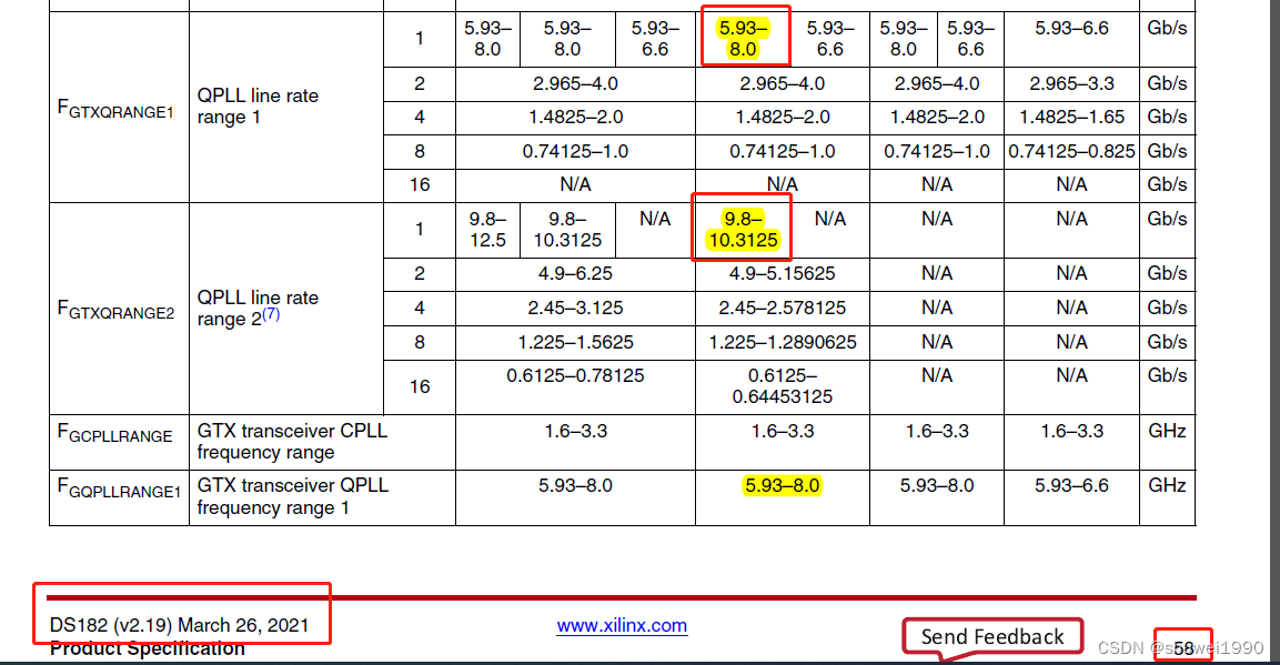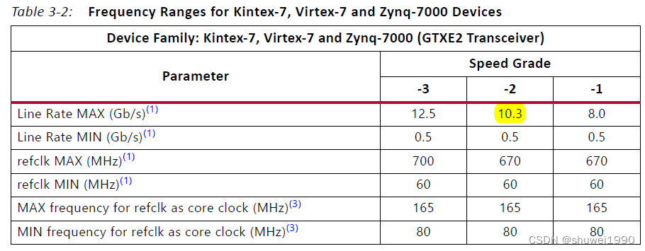在原来需求的基础上,要将单通道改成双通道。那么线速率就会变为原来的2倍,也就是12Gbps。但是我们这款FPGA芯片最高只支持10.3Gbps,如下图PG066中所述,那从单通道直接改为双通道就不行了。