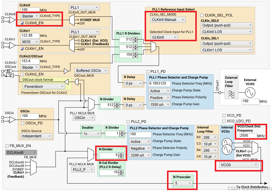 时钟芯片选择clkin0输入,两级PLL结构。VCO0是2500M,DCLKOUT0是250M,SYSREF分频比320频率7.8125MHz。