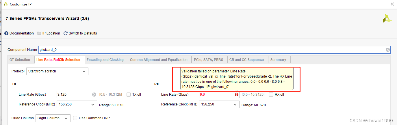 虽然9.6Gbps的线速率确实没有超过最大线速率的要求,但是很不幸,这款FPGA芯片实在是太“傲娇”了,还是不支持,如下图所示: