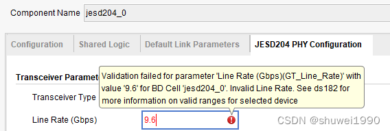 其实,JESD204 IP的底层调用的还是transceiver,所以我们可以直接打开transceiver IP,如下图所示。这里的提示就很清楚了,只支持0.5-8.0和9.8-10.3125之间的线速率。