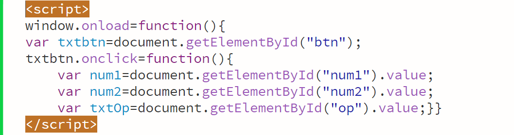 1.首先,我们需要在JS中为它的运行设置一个页面加载事件。再通过ID选择器获取到在HTML中的标签,为其添加点击事件与设置输入框的值输出;