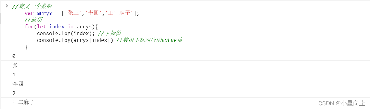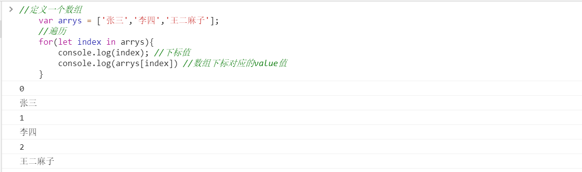 //定义一个数组var arrys = ['张三','李四','王二麻子'];//遍历for(let index in arrys){console.log(index); //下标值console.log(arrys[index]) //数组下标对应的value值}