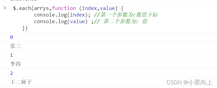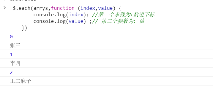 $.each(arrys,function (index,value) {console.log(index); //第一个参数为:数组下标console.log(value) ;// 第二个参数为: 值})