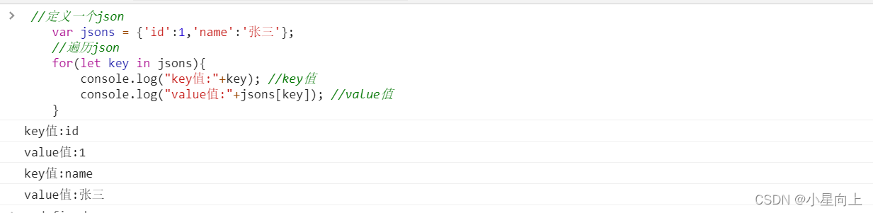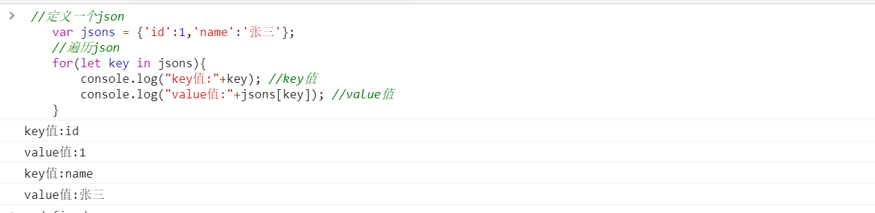 //定义一个jsonvar jsons = {'id':1,'name':'张三'};//遍历jsonfor(let key in jsons){console.log("key值:"+key); //key值console.log("value值:"+jsons[key]); //value值}