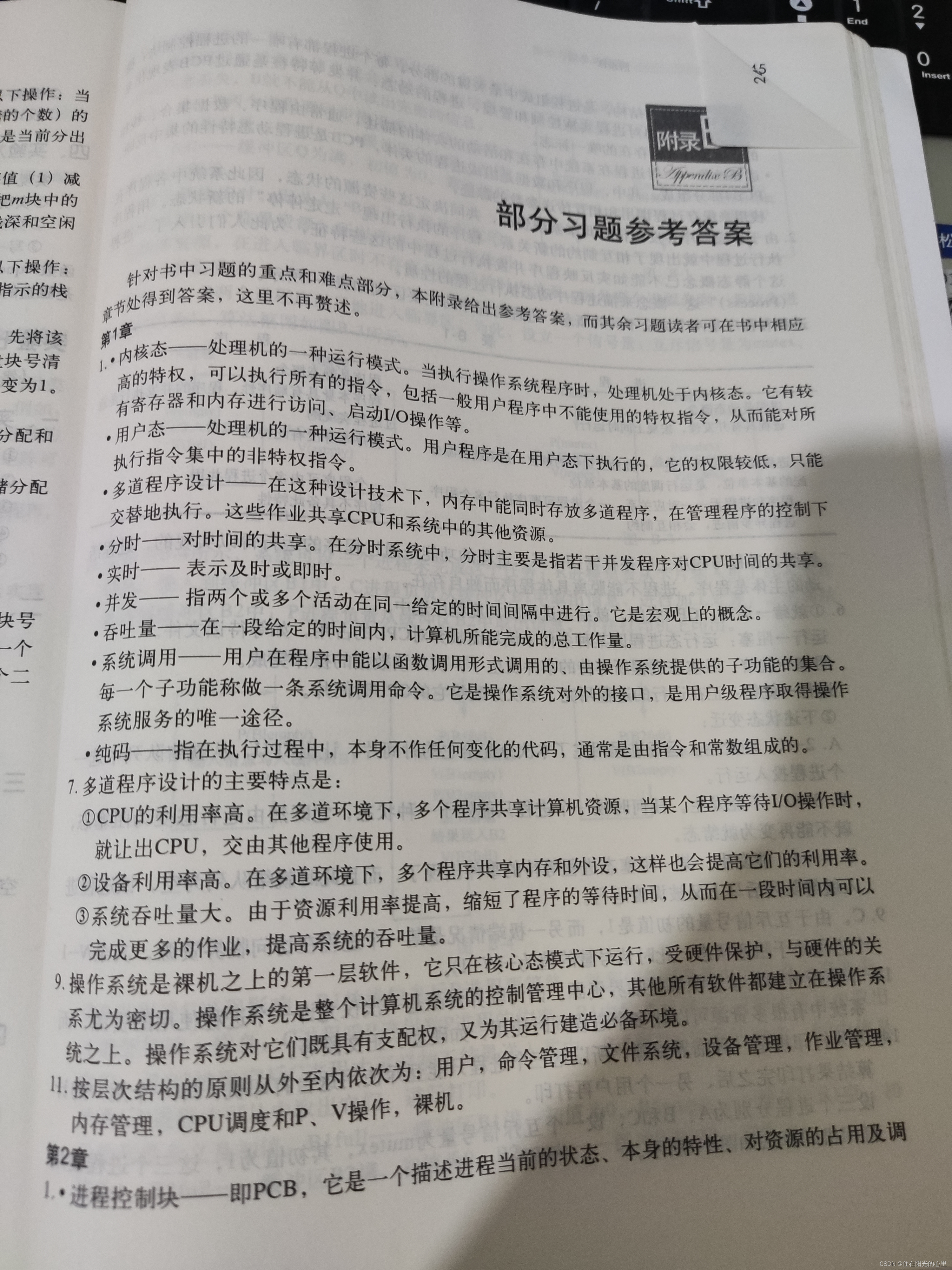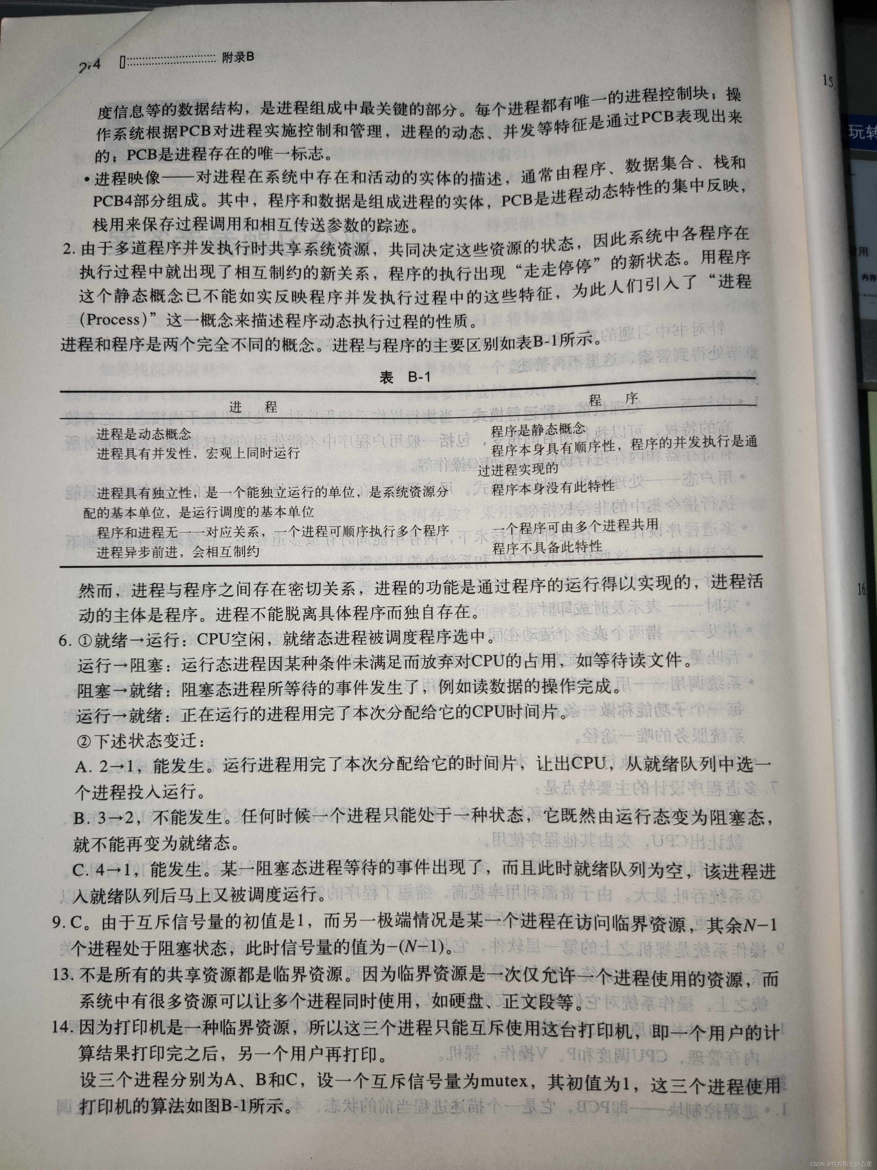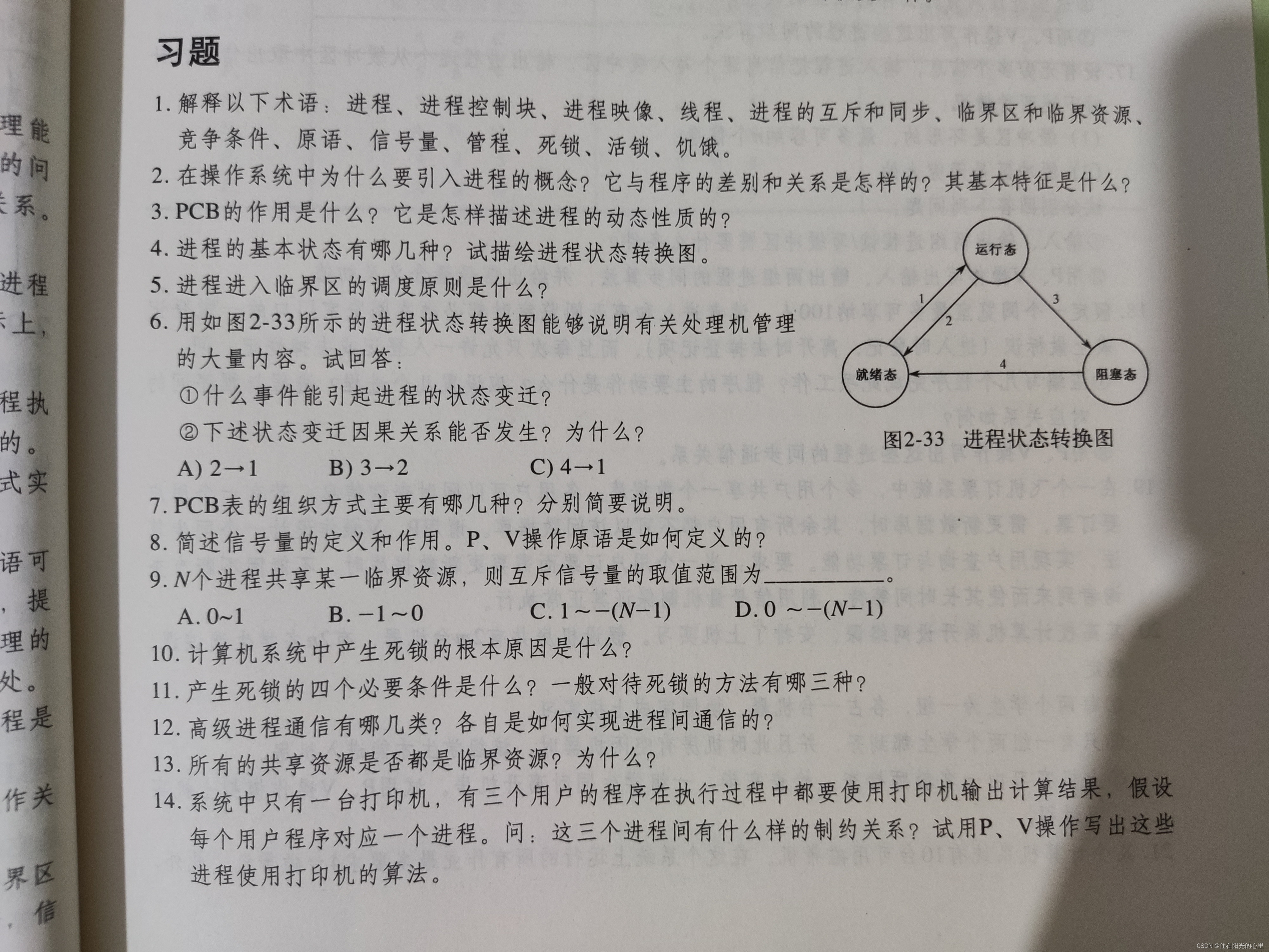 1、解释以下术语:进程、进程控制块、进程映像、线程、进程的互斥和同步、临界区和临界资源、竞争条件、原语、信号量、管程、死锁、活锁、饥饿。(红色字体表示答案已有,见最下方图片)
