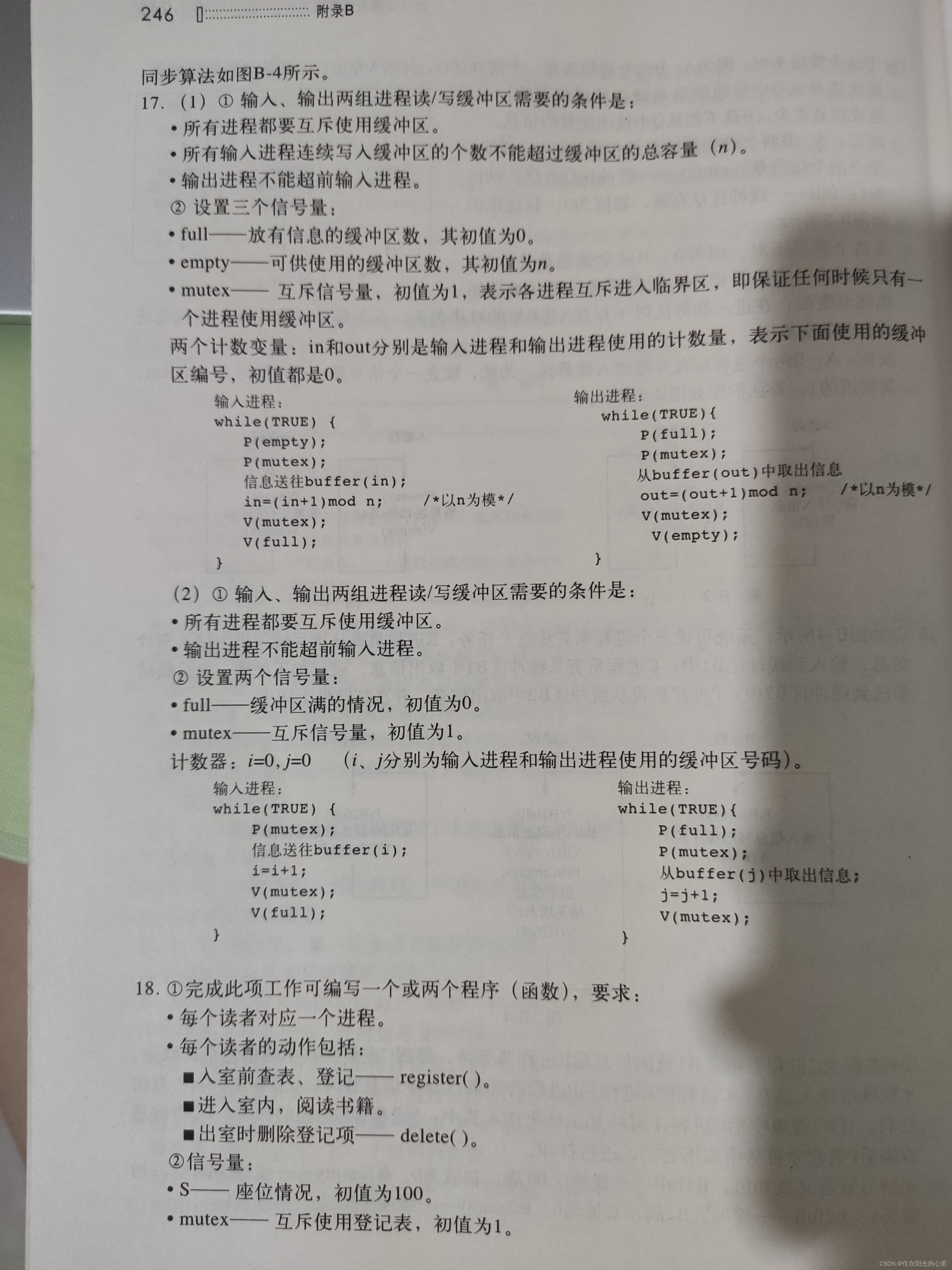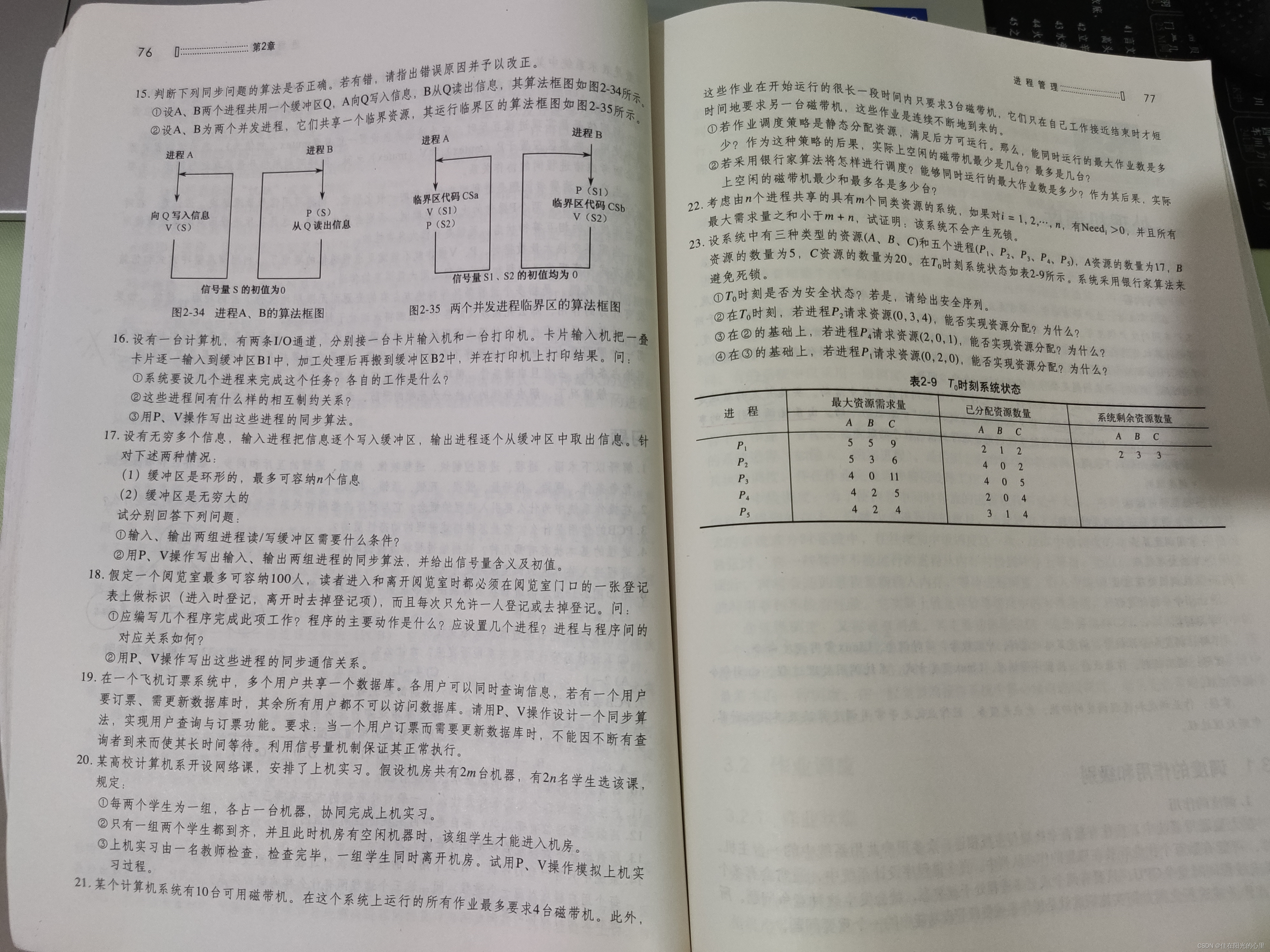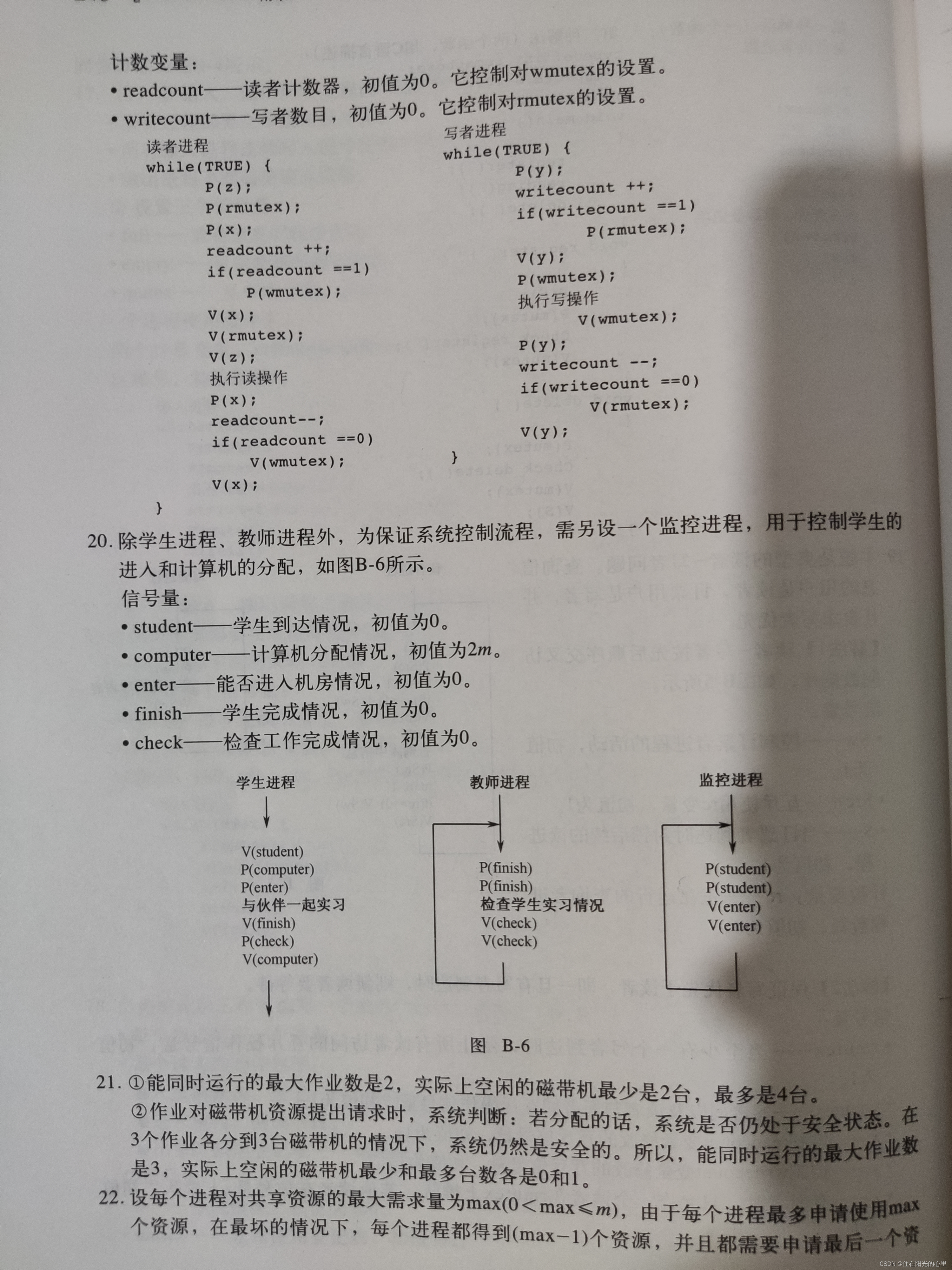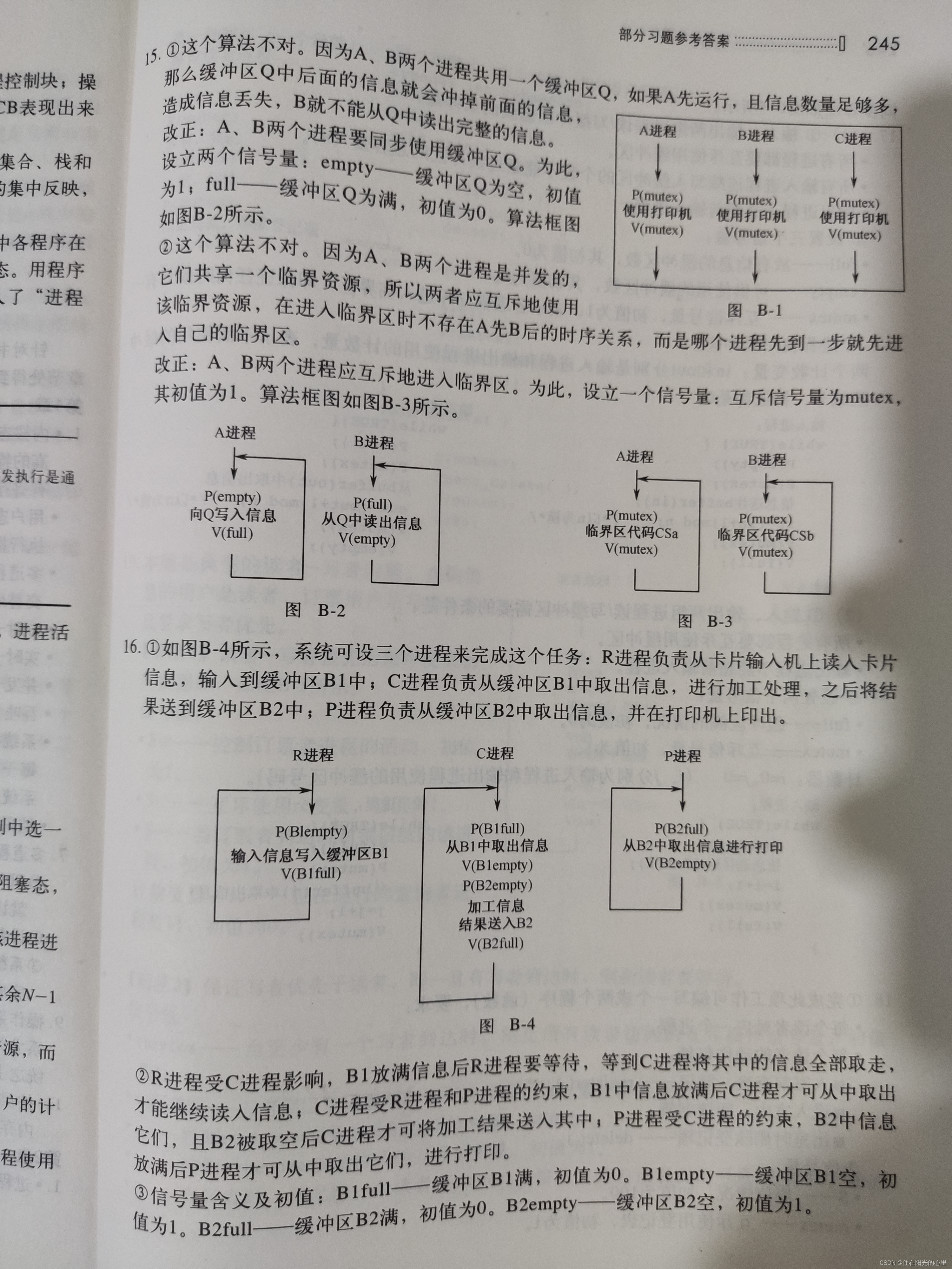 1、解释以下术语:进程、进程控制块、进程映像、线程、进程的互斥和同步、临界区和临界资源、竞争条件、原语、信号量、管程、死锁、活锁、饥饿。(红色字体表示答案已有,见最下方图片)