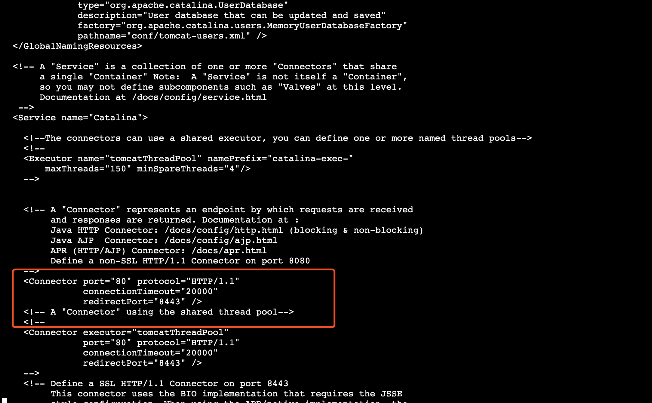因为http协议默认访问的是80端口,直接吧tomcat的访问端口改为80,这样直接访问IP就能看到tomcat页面,不用加端口号了。