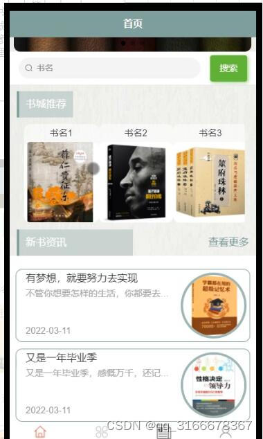 (b)用户进入系统前台可以实现首页、我的、书城、新书资讯等功能。