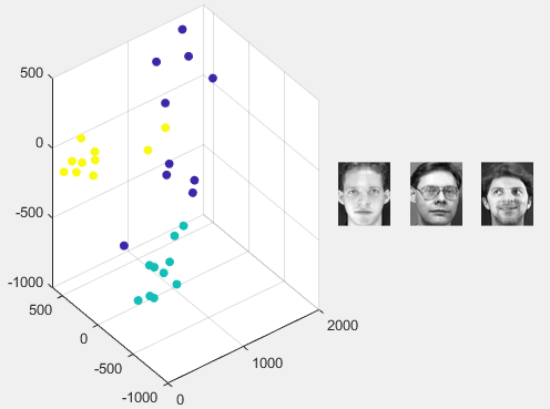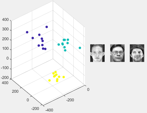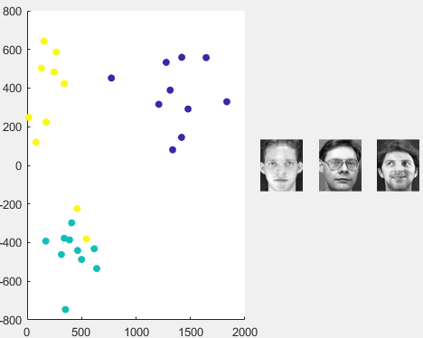 for i=[2 3]% 取出相应数量特征向量project_matrix = eigen_vectors(:,1:i);% 投影projected_test_data = project_matrix' * (reshaped_faces - all_mean);projected_test_data = projected_test_data(:,1:pic_to_show);color = [];for j=1:pic_to_showcolor = [color floor((j-1)/pic_num_in_a_class)*20];end% 显示if (i == 2)subplot(1, 7, [1, 2, 3, 4]);scatter(projected_test_data(1, :), projected_test_data(2, :), [], color, 'filled');for j=1:3subplot(1, 7, j+4);fig = show_face(test_data(:,floor((j - 1) * pic_num_in_a_class) + 1), row, column);endwaitfor(fig);elsesubplot(1, 7, [1, 2, 3, 4]);scatter3(projected_test_data(1, :), projected_test_data(2, :), projected_test_data(3, :), [], color, 'filled');for j=1:3subplot(1, 7, j+4);fig = show_face(test_data(:,floor((j - 1) * pic_num_in_a_class) + 1), row, column);endwaitfor(fig);end