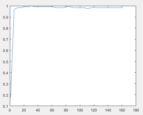 for i=1:5:161% 投影矩阵project_matrix = eigen_vectors(:,1:i);projected_train_data = project_matrix' * (train_data - all_mean);projected_test_data = project_matrix' * (test_data - all_mean);% KNN的k值K=1;% 用于保存最小的k个值的矩阵% 用于保存最小k个值对应的人标签的矩阵minimun_k_values = zeros(K,1);label_of_minimun_k_values = zeros(K,1);% 测试脸的数量test_face_number = size(projected_test_data, 2);% 识别正确数量correct_predict_number = 0;% 遍历每一个待测试人脸 for each_test_face_index = 1:test_face_numbereach_test_face = projected_test_data(:,each_test_face_index);% 先把k个值填满,避免在迭代中反复判断for each_train_face_index = 1:Kminimun_k_values(each_train_face_index,1) = norm(each_test_face - projected_train_data(:,each_train_face_index));label_of_minimun_k_values(each_train_face_index,1) = floor((train_data_index(1,each_train_face_index) - 1) / pic_num_of_each) + 1;end% 找出k个值中最大值及其下标[max_value, index_of_max_value] = max(minimun_k_values);% 计算与剩余每一个已知人脸的距离for each_train_face_index = K+1:size(projected_train_data,2)% 计算距离distance = norm(each_test_face - projected_train_data(:,each_train_face_index));% 遇到更小的距离就更新距离和标签if (distance < max_value)minimun_k_values(index_of_max_value,1) = distance;label_of_minimun_k_values(index_of_max_value,1) = floor((train_data_index(1,each_train_face_index) - 1) / pic_num_of_each) + 1;[max_value, index_of_max_value] = max(minimun_k_values);endend% 最终得到距离最小的k个值以及对应的标签% 取出出现次数最多的值,为预测的人脸标签predict_label = mode(label_of_minimun_k_values);real_label = floor((test_data_index(1,each_test_face_index) - 1) / pic_num_of_each)+1;if (predict_label == real_label)correct_predict_number = correct_predict_number + 1;endendcorrect_rate = correct_predict_number/test_face_number;X = [X i];Y = [Y correct_rate];fprintf("k=%d,i=%d,总测试样本:%d,正确数:%d,正确率:%1f\n", K, i,test_face_number,correct_predict_number,correct_rate);if (i == 161)waitfor(plot(X,Y));end