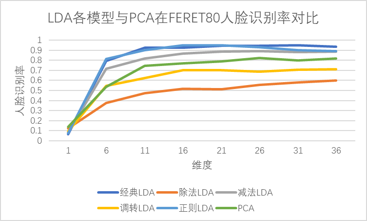 图3 LDA的各模型与PCA在FERET人脸识别率对比