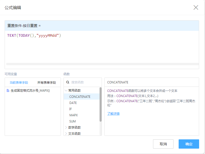 (1)新建单行文本字段,命名为“重置条件-按日重置”,设置不可见,表单属性-不可见字段赋值-始终重新计算,对其写公式: