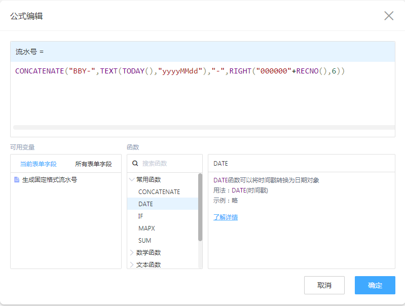 (2)新建单行文本字段,命名为“流水号”,设置不可编辑,勾选不允许重复值,对其写公式。