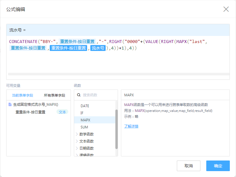 ③ 取出上一个编号的最右四位数,转换成数字并加1,得到新的号码:VALUE(RIGHT(MAPX(“last”,重置条件-按日重置,重置条件-按日重置,编号),4))+1。