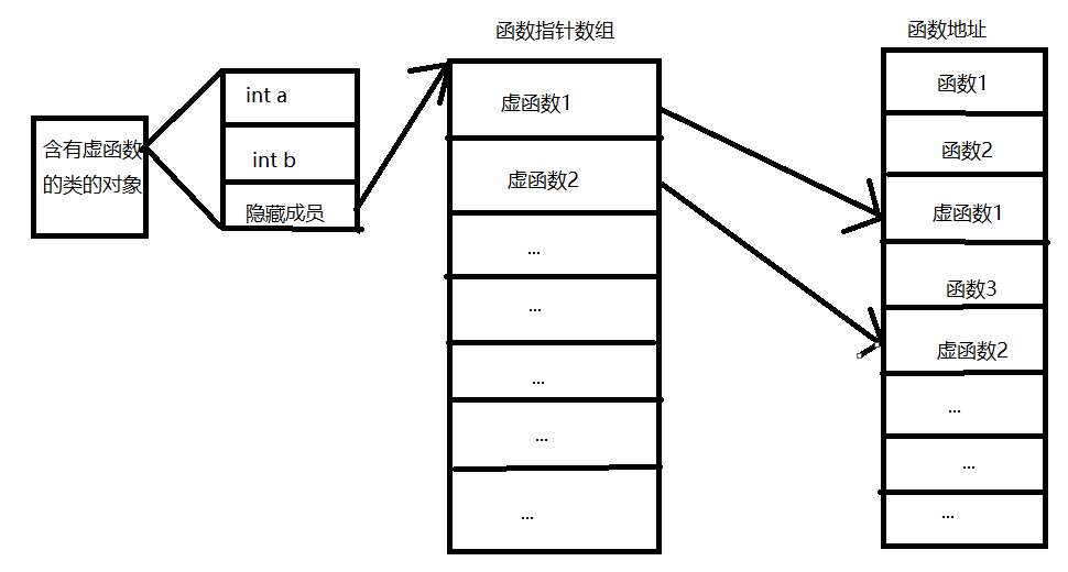- 我们在声明了一个虚函数类的对象的同时,这个对象被添加了一个隐式成员。该成员保存了指向虚函数地址数组的指针。
