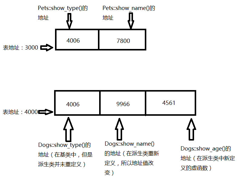 例如:基类对象包含一个指针,该指针指向基类中所有虚函数的地址表,派生类将包含一个指向独立地址表的指针。两个表是相互独立的!当派生类重新实现了基类中的虚函数,那么派生类的虚函数表将保存新的函数地址。如果派生类并未对虚函数做改动,那么虚函数表将保存原始函数地址。也就是说,派生类的虚函数表进行改动并不会对基类的虚函数表有影响。
