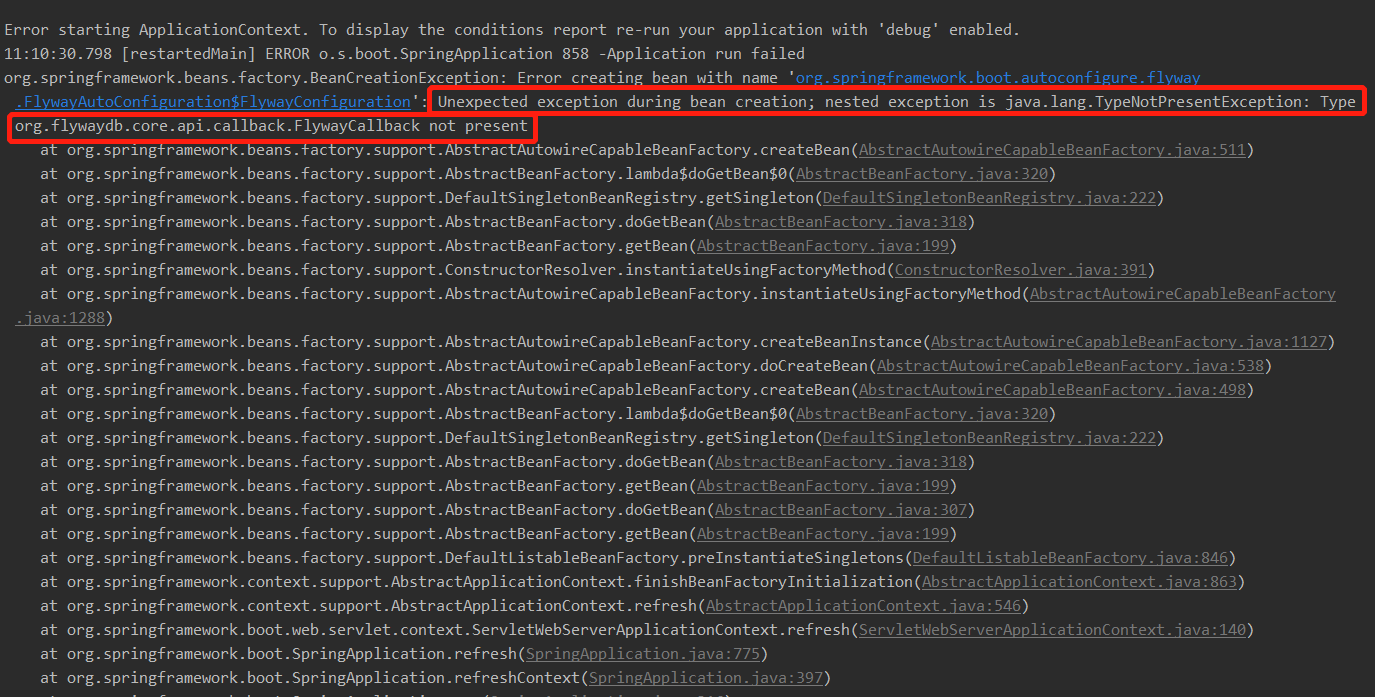 这里开始引用的Flyway是6.1.0 版本,启动后报错:
