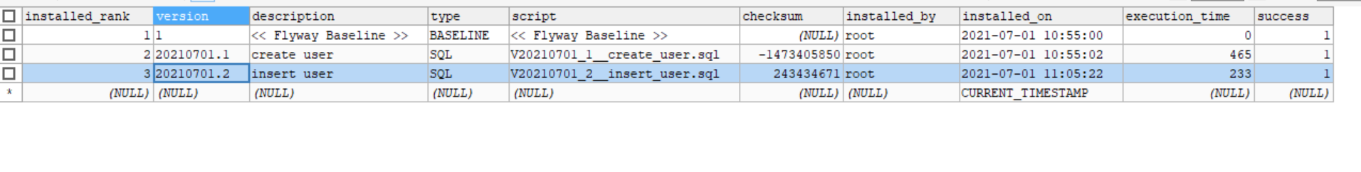 启动成功,创建了flyway_schema_history 表并在数据库中已按照定义好的脚本,完成数据库变更,并在flyway_schema_history表插入了sql执行记录: