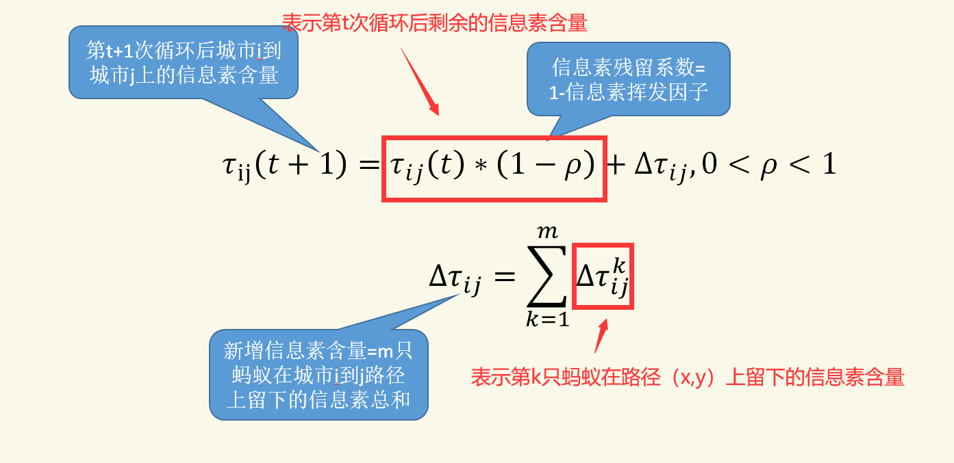 其实这个公式也很好理解,蚂蚁选择城市的概率主要由𝜏ij (t)和𝜂ij (𝑡)有关,分母为蚂蚁k可能访问的城市之和(为常数),这样才能使蚂蚁选择各个城市的概率之后为1,符合概率的定义。𝜏ij (t)和𝜂ij (𝑡)上的指数信息素因子ɑ和启发函数因子𝛽只决定了信息素浓度以及启发函数对蚂蚁k从i到j的可能性的贡献程度。