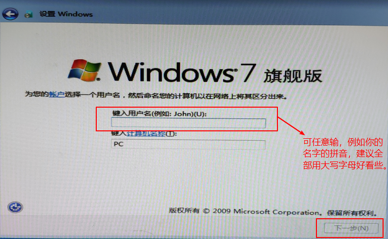 2、创建自己的用户名(用户不宜过长)和PC名称,输入完成后点击“下一步”