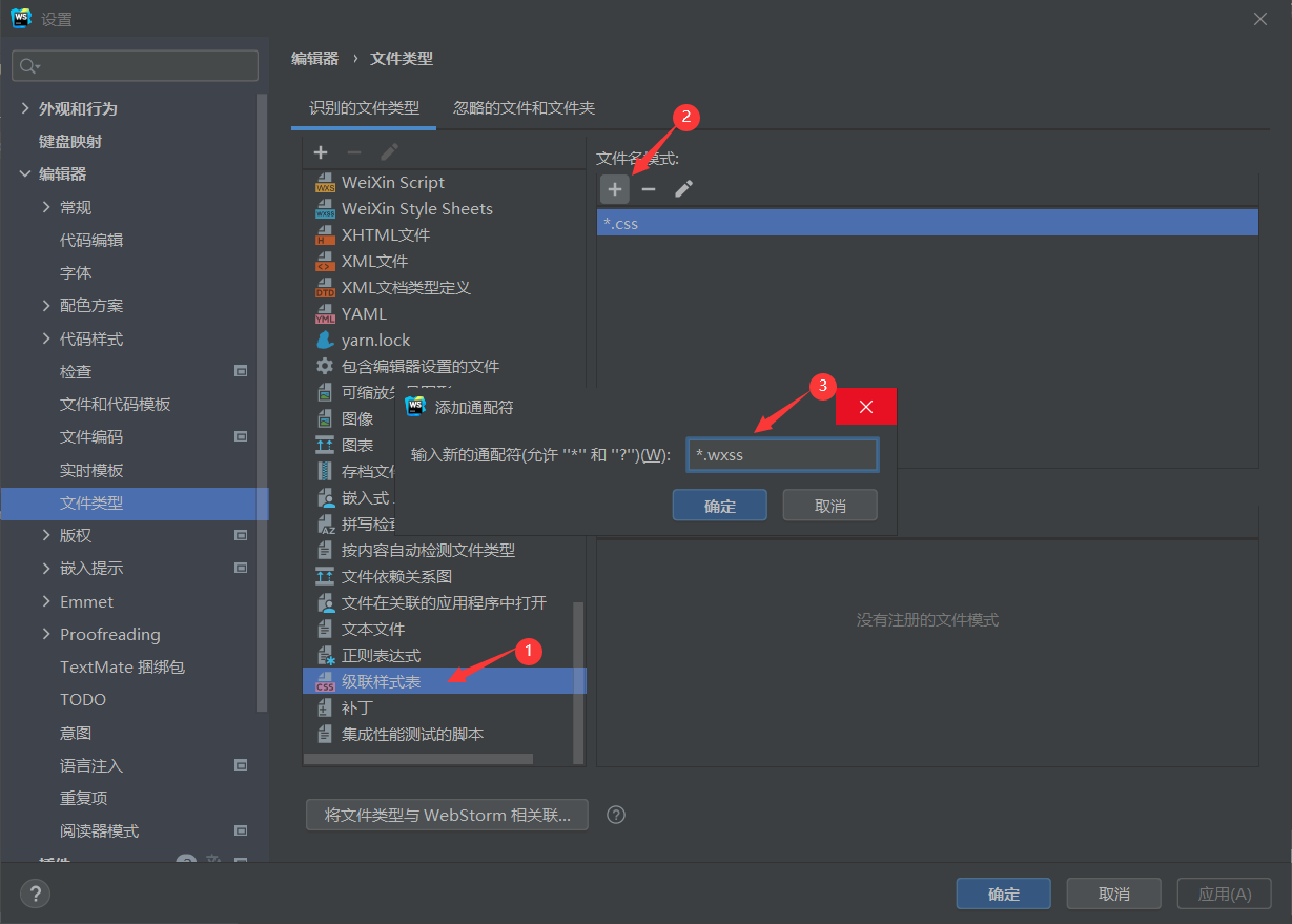 识别的文件类型列表中,选择css文件,点击’+’,输入 *.wxss,确定。