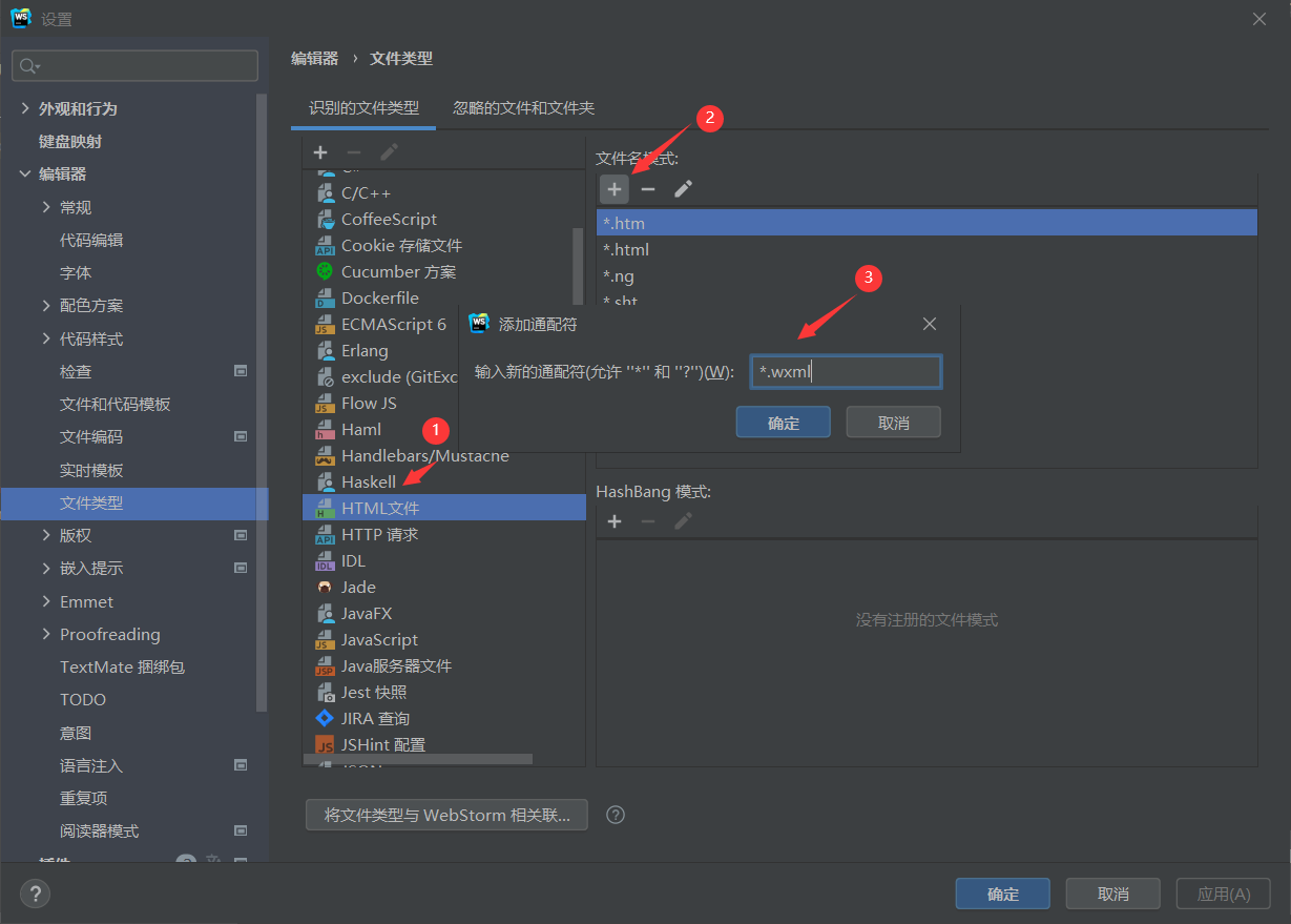 识别的文件类型列表选择HTML文件,点击’+’,输入*.wxml,确认。
