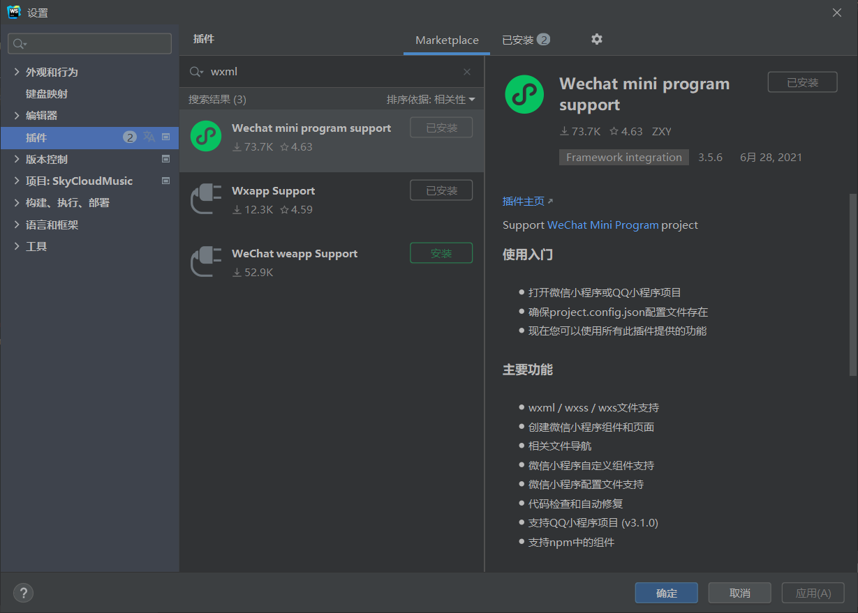 在Plugin中点Markplace,输入框中搜索Wxapp(或者Wxapp Support)插件,点击install,安装小程序插件,确认配置。也可以下载wecharCode.jar,然后在webStorm 的 File -> import settings 中导入即可。到这里我们就可以在webstorm里智能补全微信小程序代码了。