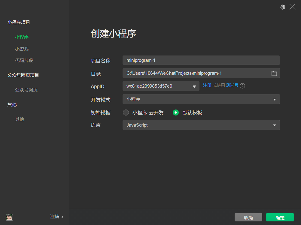 新建一个项目->项目名称->填写小程序名字,目录->本地存放小程序的文件路径,APPID->第三步,开发模式->小程序,初始模板->默认模板,语言->JavaScript。