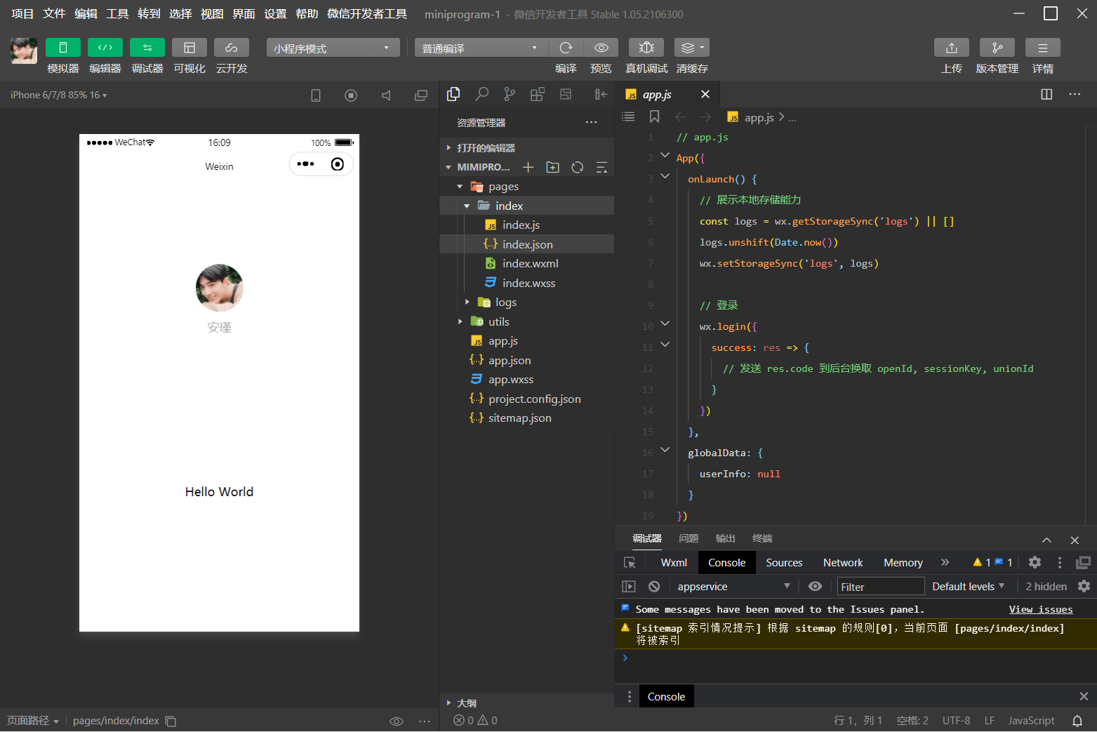 项目新建完成后,进入小程序开发界面,最左边是手机端模拟界面(可选择适应机型),中间是小程序的目录文件和配置文件,最右边是编写代码的区域,以及下面的控制台区域,可以运行和调试代码。