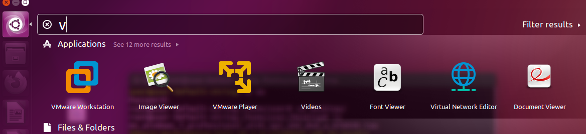 3,安装成功后再左上角搜索vmware 就可以看到虚拟机的图标。也可以直接拖动到左边菜单栏中(选中然后鼠标左键直接拖动即可)