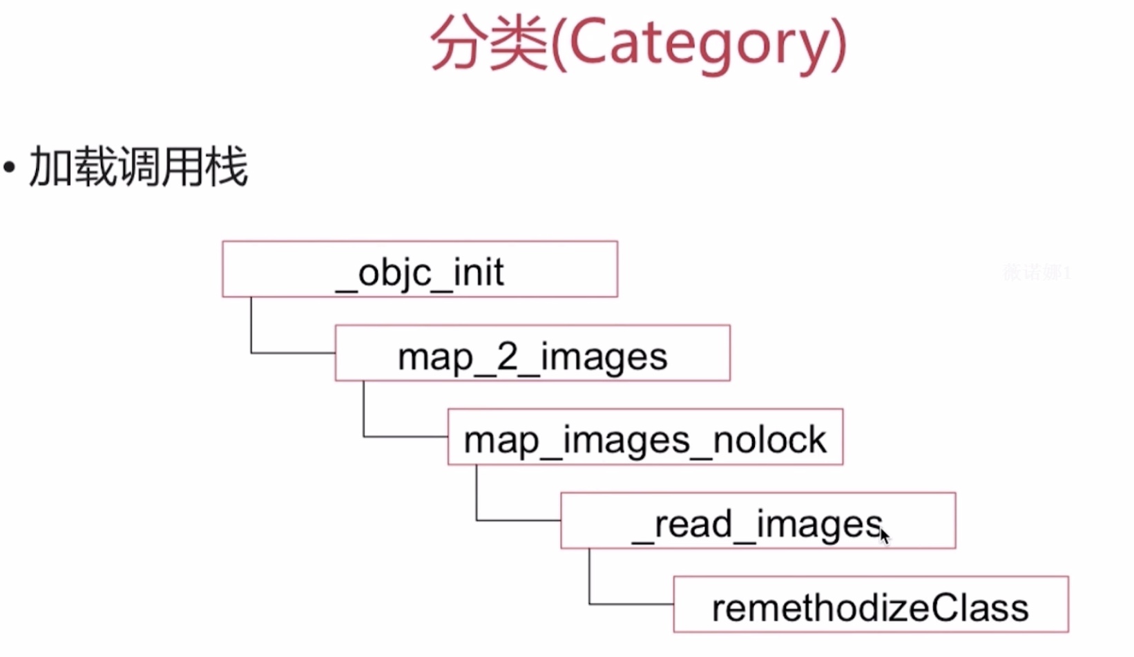 1.4加载调用栈 objc_init ->map_I_images镜像->map_images_nolock->read images->remethodizeclass