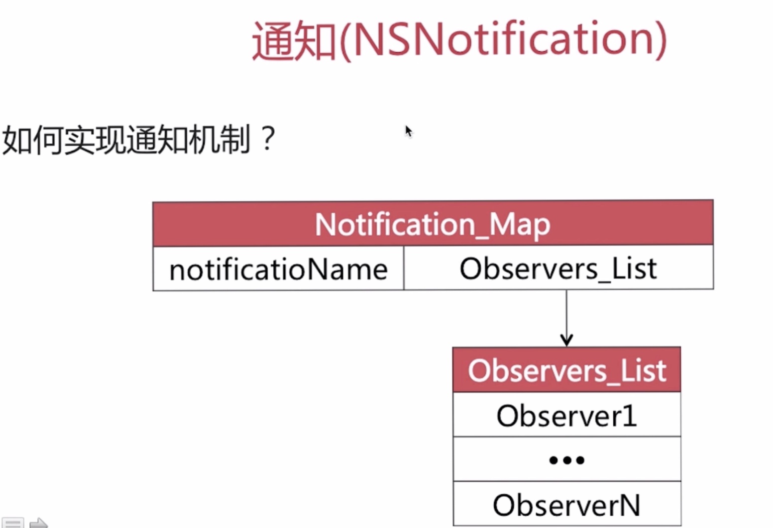 在通知中心,系统会维护一个字典,value是数组列表,列表中每一个成员首先应该包含通知接收的观察者,还包含观察者调用的方法。