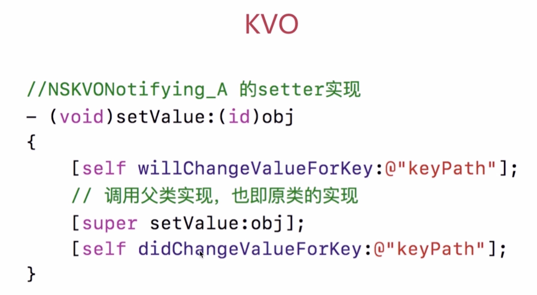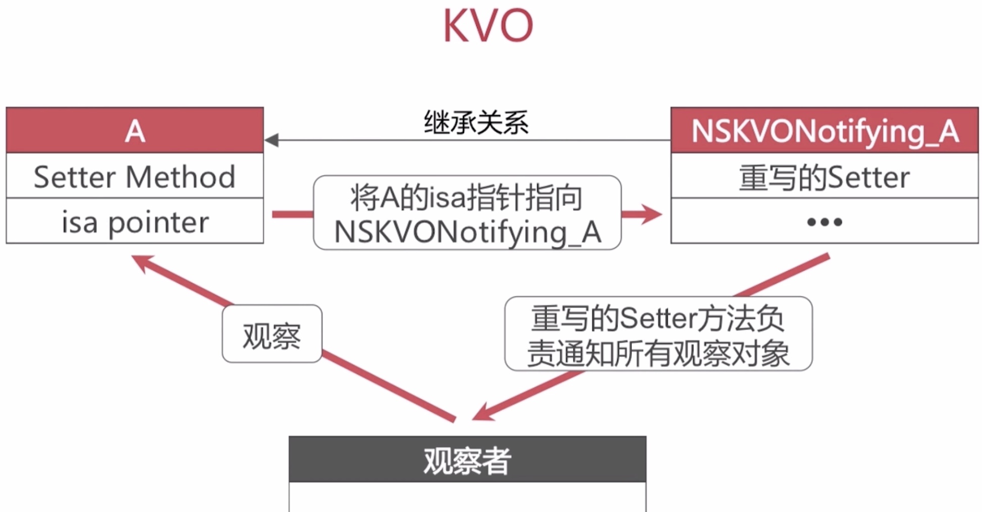 6.2实现原理:(关键词:addObserver: forKeyPath: 运动建NSKVONotifying_A)注册观察者,实际是调用系统的addObserver: forKeyPath:方法,观察者观察A的某一成员变量或属性,系统会在运行时动态创建NSKVONotifying_A,此时会将原来的A的isa指针指向NSKVONotifying_A(继承自原来的A),这也是isa混写技术在KVO的体现,NSKVONotifying_A重写setter方法负责通知所有观察者对象。