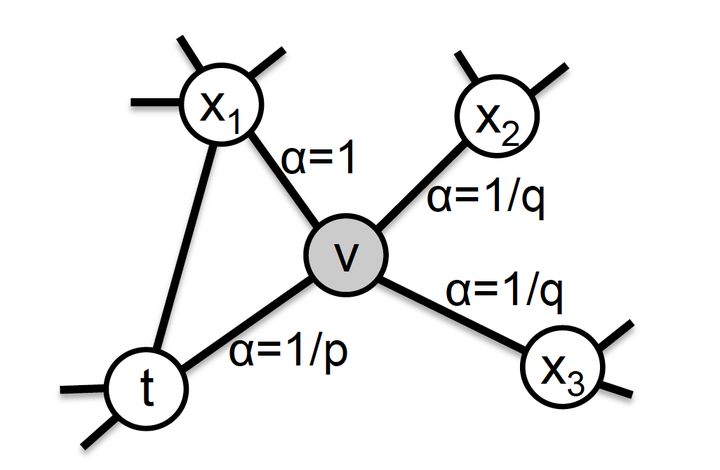 我们在图2中进行说明:其中 t t t 为节点 v v v的上一个节点, d t , x d_{t,x} dt,x表示节点 t t t与节点 x x x的最短距离,例如如果两个节点直接相连,那么 d t x = 1 d_{tx}=1 dtx=1。如果两个节点为相同的节点, d t x = 0 d_{tx}=0 dtx=0。如果两个节点不相连,则 d t x = 2 d_{tx}=2 dtx=2。参数 p p p 为返回参数, p p p越小,节点返回 t t t的概率越高,图的遍历越倾向于BFS,越趋向于表示图的结构性。参数 q q q则被称为进出参数, q q q越小,遍历到远处节点的概率越高,图的遍历越倾向于DFS,同时越趋向于表示图的同质性。我们可以通过设置 p , q p,q p,q的值,来权衡graph embedding表达的结果的倾向性。