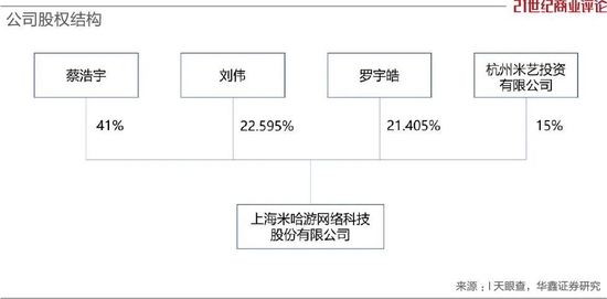 米哈游三位创始人蔡浩宇、刘伟和罗宇皓,为上海交通大学同学。天眼查显示,三人的持股比例分别为41%、22.6%和21.4%。