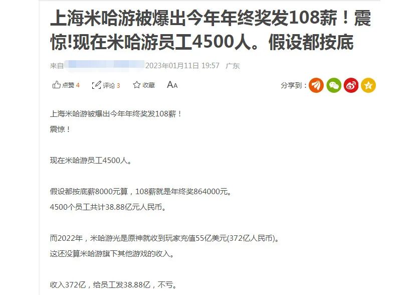 1月12日,针对“年终奖108薪”的消息,米哈游方面回应《21CBR》记者称,消息不实。