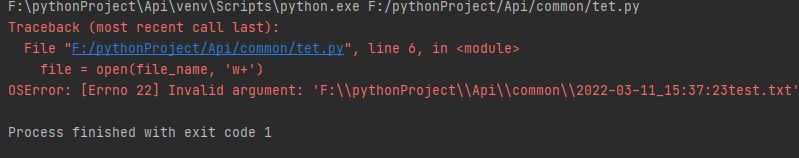 在做文件读取写入操作的时候遇见OSError: [Errno 22] Invalid argument: 'F:\\pythonProject\\Api\\common\\2022-03-11_15:37:23test.txt'的报错,单独的打印出文件路径明明是正确,但使用python open()函数读写文件时就会报该错误