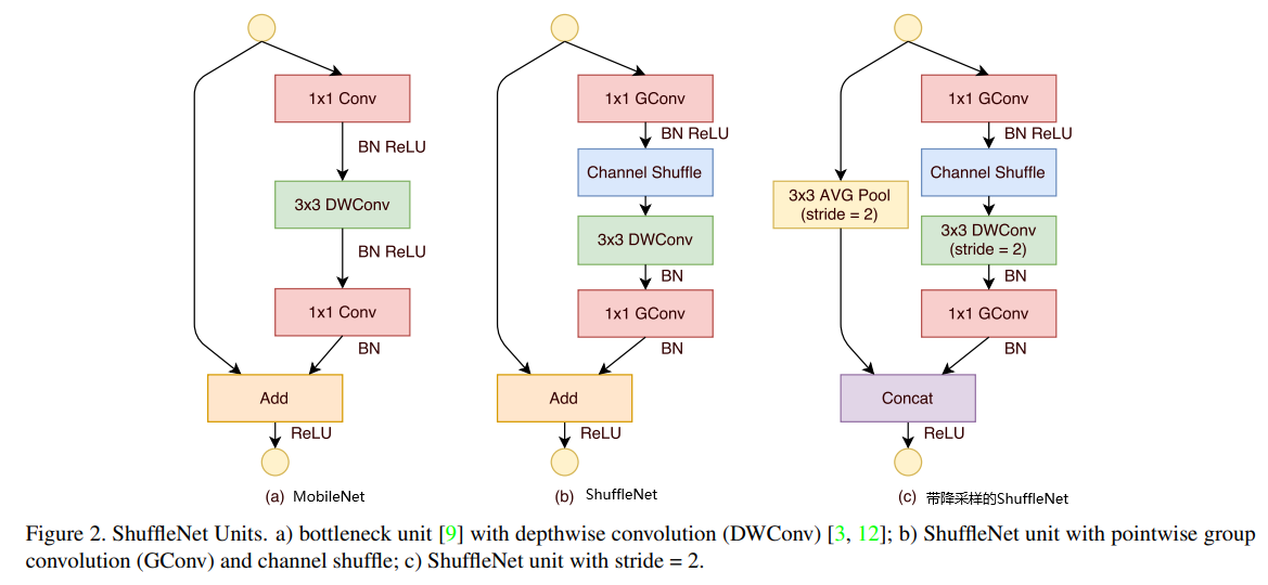 b和c介绍了ShuffleNet v1全部的实现细节: