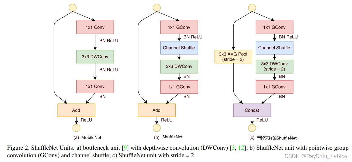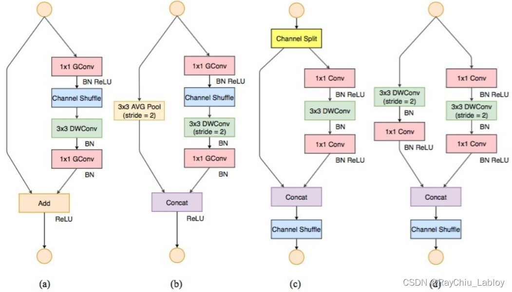 如图c中需要降采样的情况,左侧shortcut部分使用的是步长为2的 3*3 平均池化,右侧使用的是步长为2的 3*3 的Depthwise卷积。