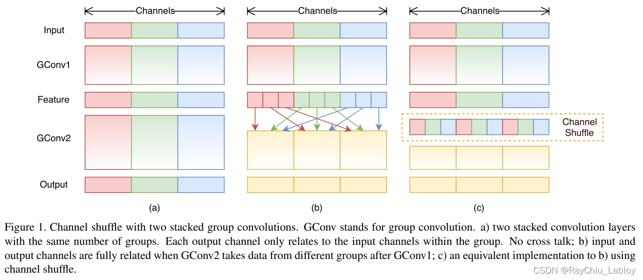 这时大量的对于整个Feature Map的Pointwise卷积成为了ResNeXt的性能瓶颈。一种更高效的策略是在组内进行Pointwise卷积,但是这种组内Pointwise卷积的形式不利于通道之间的信息流通,为了解决这个问题,ShuffleNet v1中提出了通道洗牌(channel shuffle)操作。
