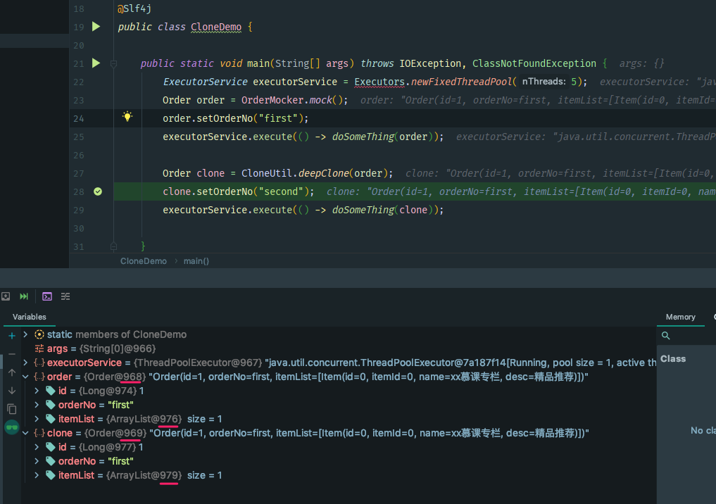 - 在多线程环境中,如果我们不通过克隆构造新的对象,线程池中两个线程会公用同一个对象,后面对订单号的修改将影响到其它线程。因此如果能够克隆一个新的对象,并且对新对象的修改不影响原始对象,就能实现我们期待的效果。