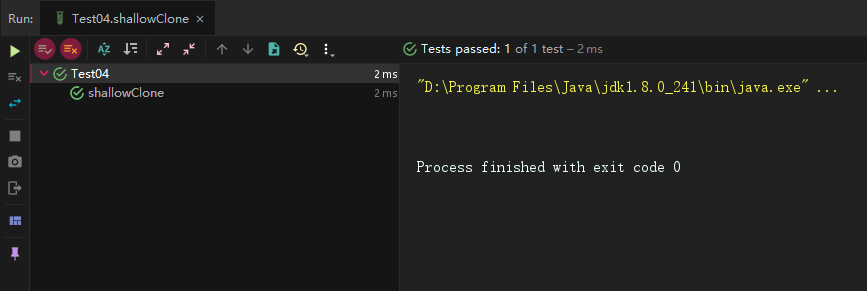 public class Test04 {@Testpublic void shallowClone() {Goods goods = GoodsMocker.mock();Goods cloneGoods = goods.clone();Assert.assertFalse(goods == cloneGoods);Assert.assertTrue(goods.getGoodsSkuList() == cloneGoods.getGoodsSkuList());}}