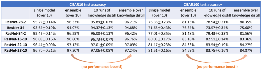 但接下来这个现象就让人难以理解了,使用自蒸馏技术,也即老师的学生就是它自己:通过对具有相同架构的单个模型进行知识蒸馏,竟然可以提高测试准确率。