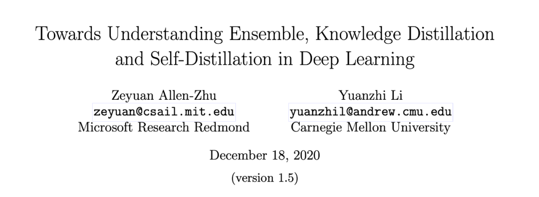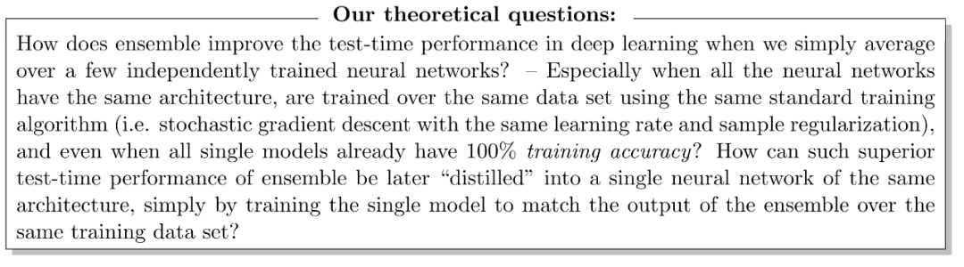 来自微软研究院机器学习与优化组的高级研究员朱泽园博士,以及卡内基梅隆大学机器学习系助理教授李远志针对这一现象,在最新发表的论文《在深度学习中理解集成,知识蒸馏和自蒸馏》(Towards Understanding Ensemble, Knowledge Distillation, and Self-Distillation in Deep Learning)中,提出了一个理论问题: